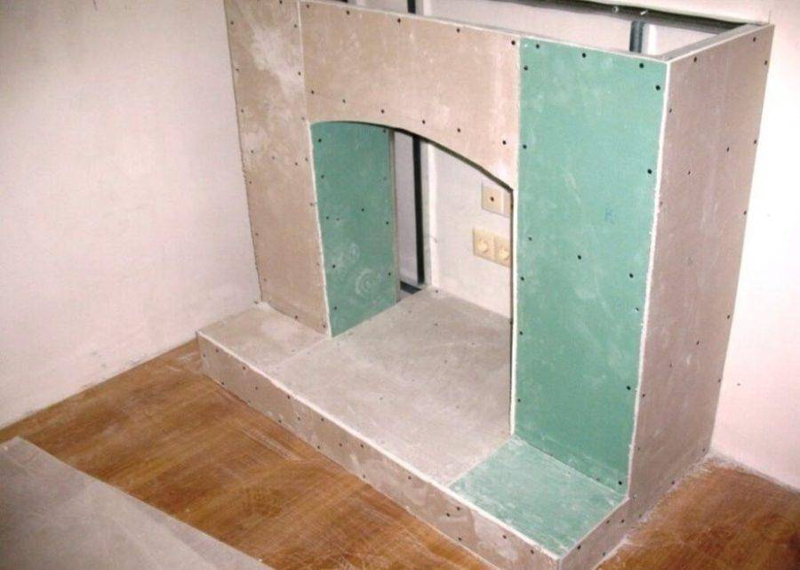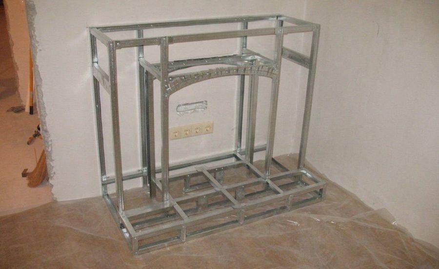 По вышеуказанному принципу создают дымоход (можно обойтись и без него). Обычно он имеет ширину равную порталу, но выступает меньше. Если его используют для навески телевизора, то место фиксации дополнительно усиливают перемычками из профилей.