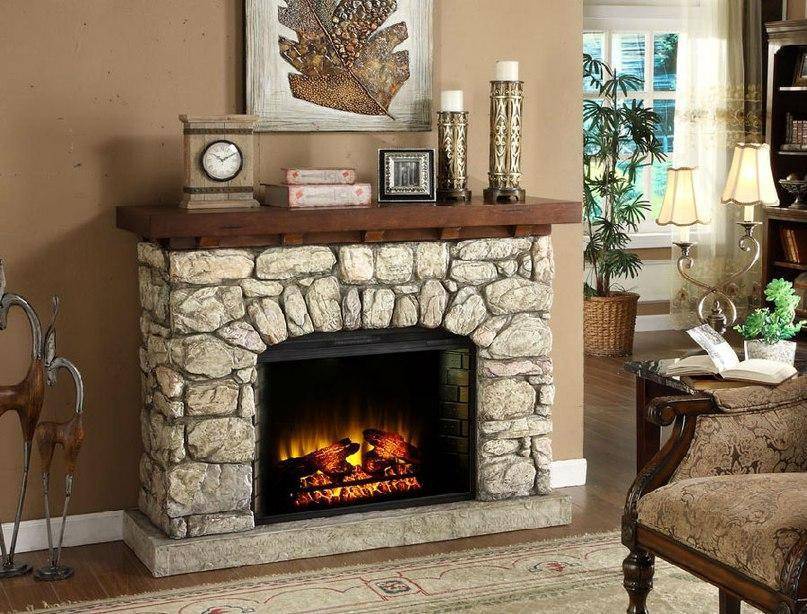 На следующем этапе выполняется декорирование конструкции и установка нагревательного элемента. Провести декорирование электрокамина можно в любом дизайне, использую для этого разнообразные материалы: