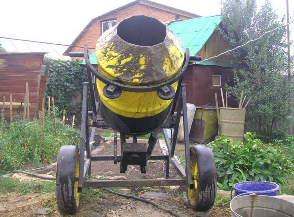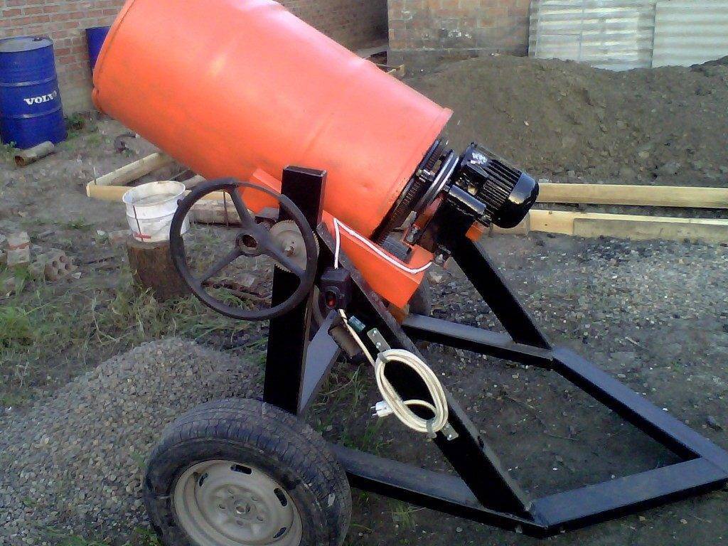 В качестве емкости можно использовать бидон из-под молока или старую ненужную металлическую бочку. Такую бочку или металлический бидон следует установить на выполненном при помощи сварки металлокаркасе. Ось вращения закрепляется внутри или снаружи ёмкости, а привод выполняется при помощи небольших шестерёнок и прочной ручки. Внутри емкости можно приварить или закрепить небольшие лопасти, что улучшит размешивание раствора. Останется лишь выполнить небольшие металлические ножки, которые привариваются к несущему каркасу.