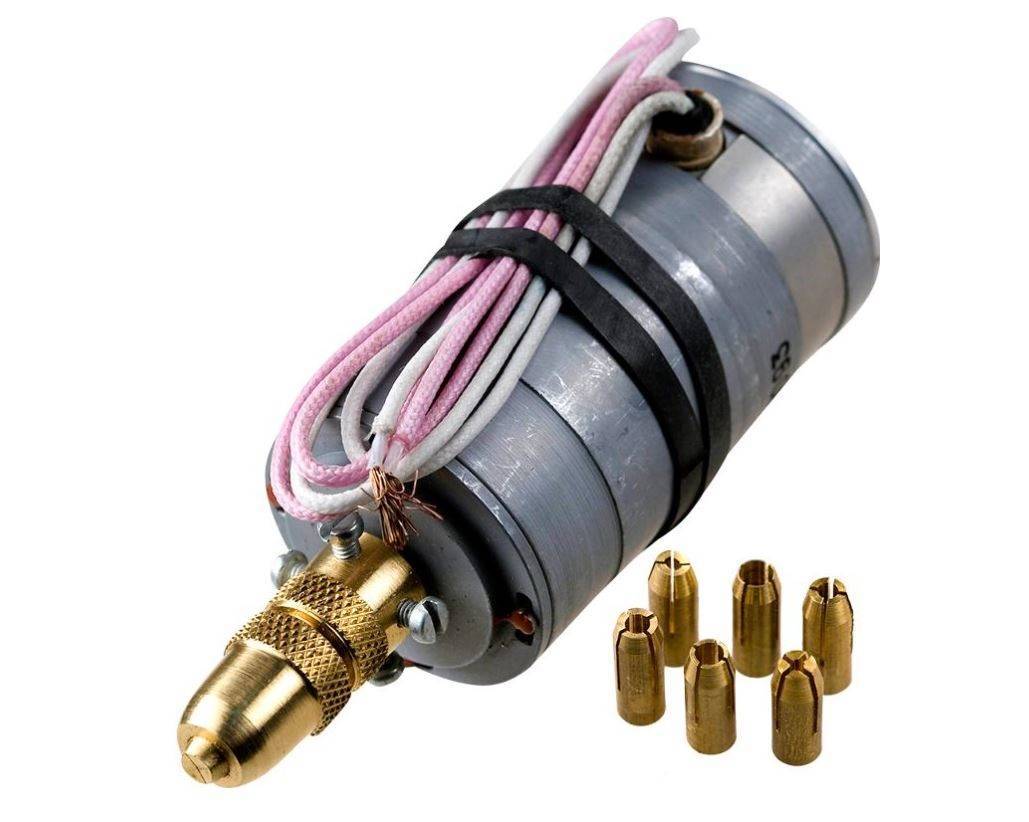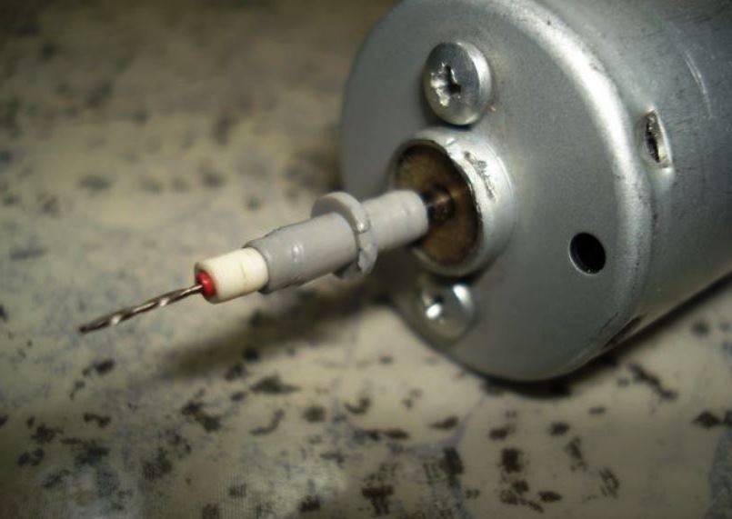 Найти сверло подходящего размера не составит труда. Вставьте сверло в корпус цанги и плотно зажмите. Далее, готовую насадку необходимо установить на корпус моторчика. Цанга должна плотно садиться на вал двигателя. В противном случае вам не избежать вибрации. Патрон на самодельную мини дрель готов.
