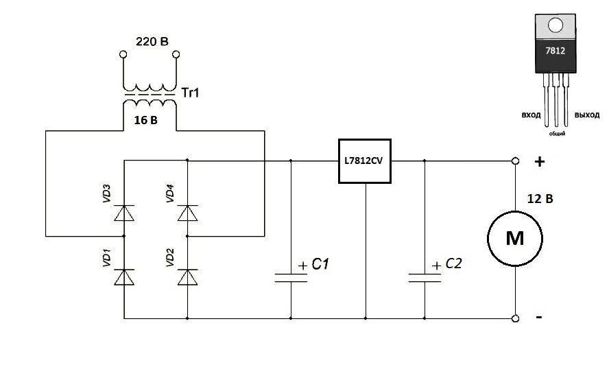 Нашему мотору ни к чему пульсации выпрямленного напряжения, поэтому на выходе подключаем электролитический конденсатор на 25 вольт емкостью около 1000 мкФ. Он будет сглаживать выходной ток. Несмотря на простоту, такой тандем работает устойчиво, с одним лишь недостатком: при повышении нагрузки напряжение падает. То есть, при равномерном вращении – блок питания выдает 12 вольт. А если вы сверлите «тяжелый» материал – надо следить за оборотами, не давая им опуститься. Иначе вал просто остановится.