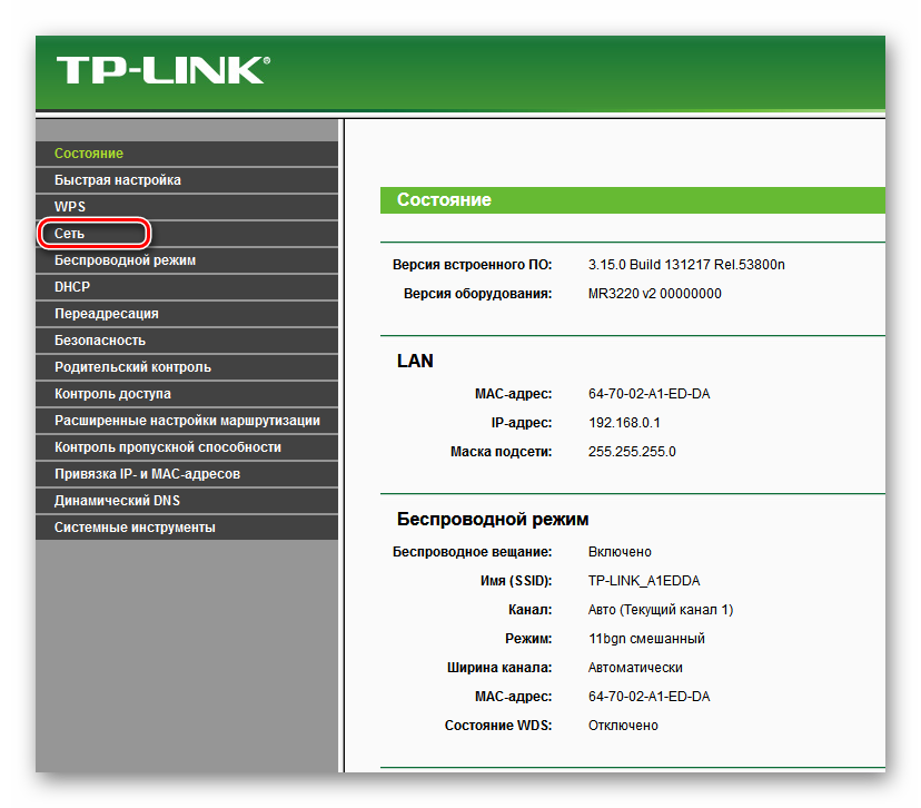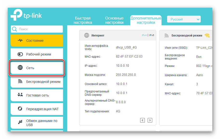 В правой части страницы находим графу «Сеть», куда и перемещаемся.