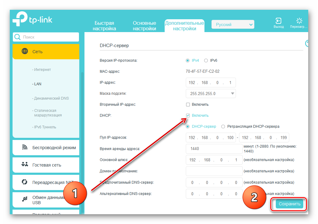 Проверяем состояние DHCP-сервера. Он должен быть задействован в обязательном порядке. Ставим отметку в нужном поле. Сохраняем изменения. Выходим из веб-клиента главного роутера.