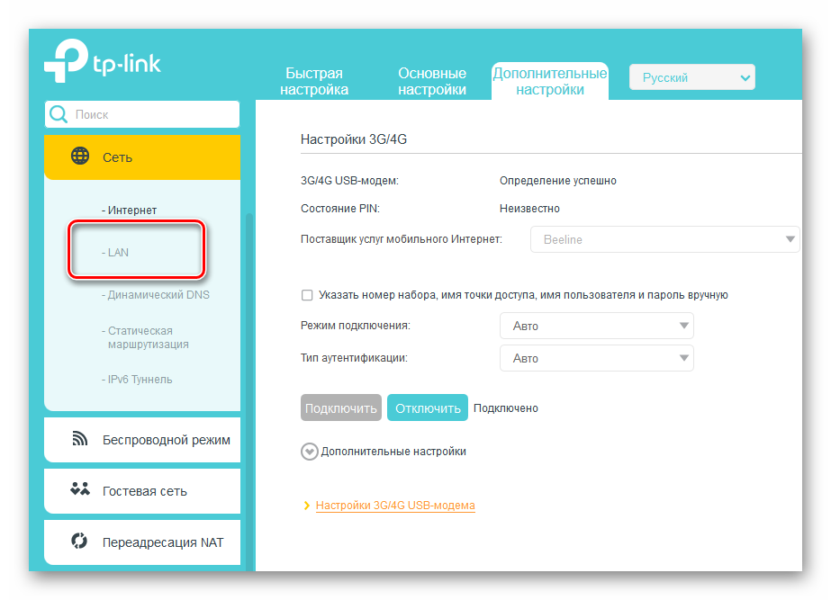 В выпадающем подменю выбираем раздел «LAN», где нам необходимо проверить важные параметры конфигурации для нашего случая.