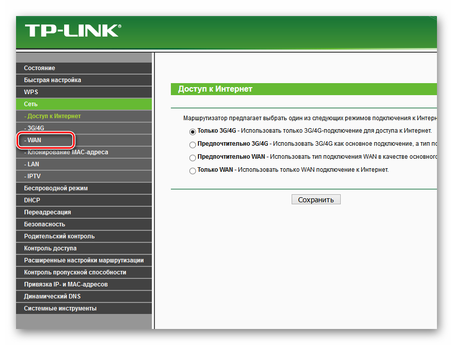 Далее нас очень интересует раздел «WAN», где нужно убедиться в правильности действующей конфигурации для поставленной цели соединения двух роутеров и внести исправления при необходимости.