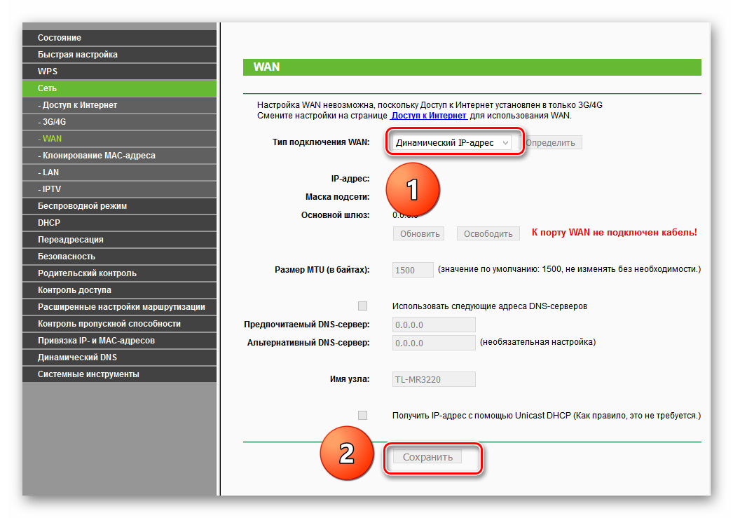 На странице «WAN» устанавливаем тип подключения — динамический IP-адрес, то есть включаем автоматическое определение сетевых координат. Нажимаем на кнопку «Сохранить».