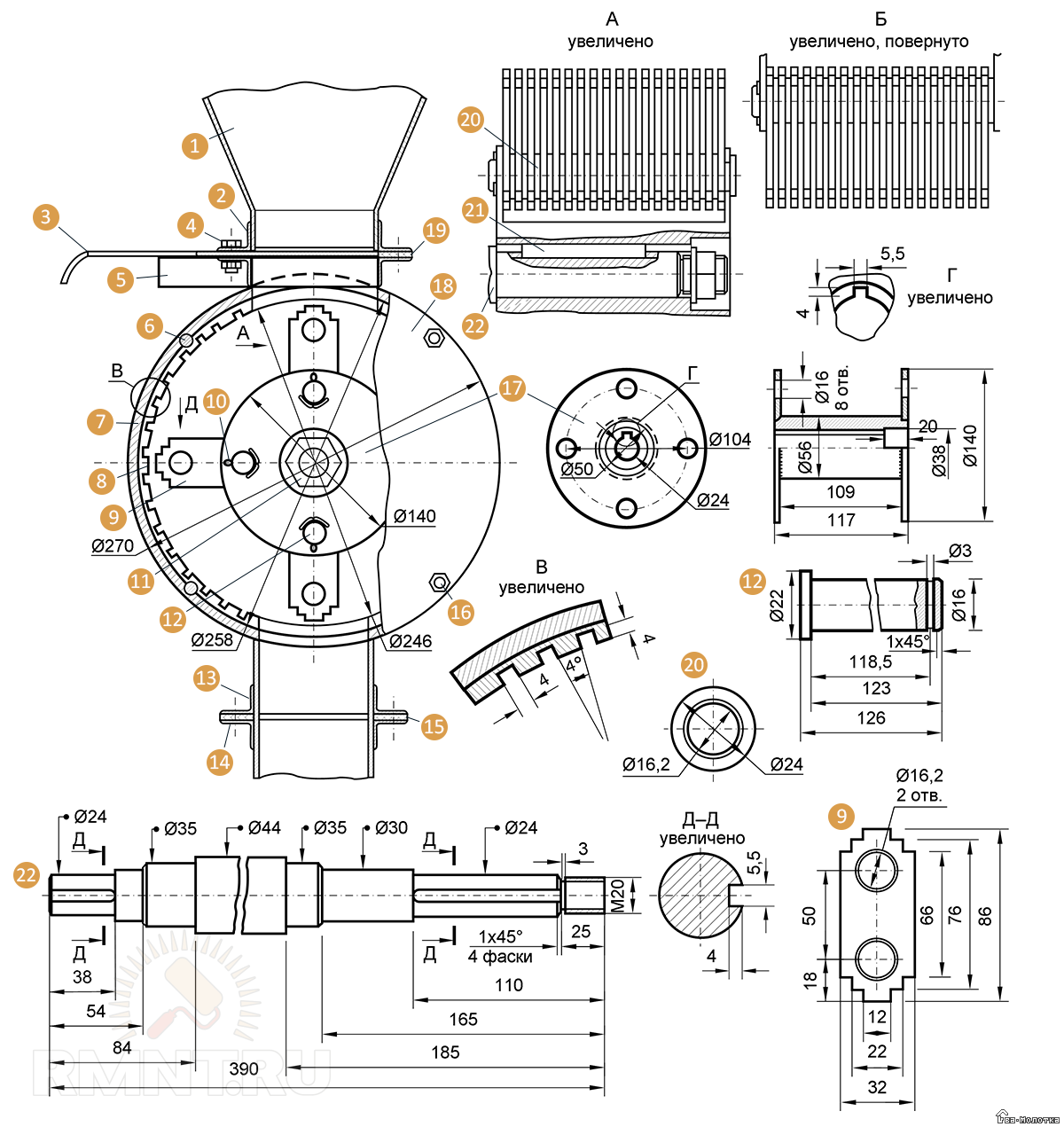 1 — загрузочный бункер (лист δ1 мм); 2 — окантовка горловины загрузочного бункера (уголок 25х25); 3 — заслонка/задвижка (лист δ1 мм); 4 — болт М6 для стяжки (8 шт.); 5 — обрамление загрузочного отверстия в корпусе (уголок равнополочный 25 мм); 6 — шпилька М8 (8 шт.); 7 — наружный барабан корпуса (труба Ø 270х6); 8 — статор с бороздками (труба Ø 258х6); 9 и 20 — молоточки и дистанционные шайбы (лист δ3 мм, закалённый до твёрдости HRC 45–47, 72 шт. и 70 шт. соответственно); 10 — шпингалет Ø 3 (4 шт.); 11 — гайка М20 с пружинной шайбой; 12 — ось молоточков (круг Ø 22, 4 шт.); 13, 14 — обвязка патрубков (уголок равнополочный 25 мм); 15, 19 — прокладки (резина, лист δ3 мм); 16 — гайка М8 крепления фланца (8 шт); 17 — молотковый ротор; 18 — фланец (лист δ5 мм, 2 шт.); 21 — фиксатор; 22 — приводной вал