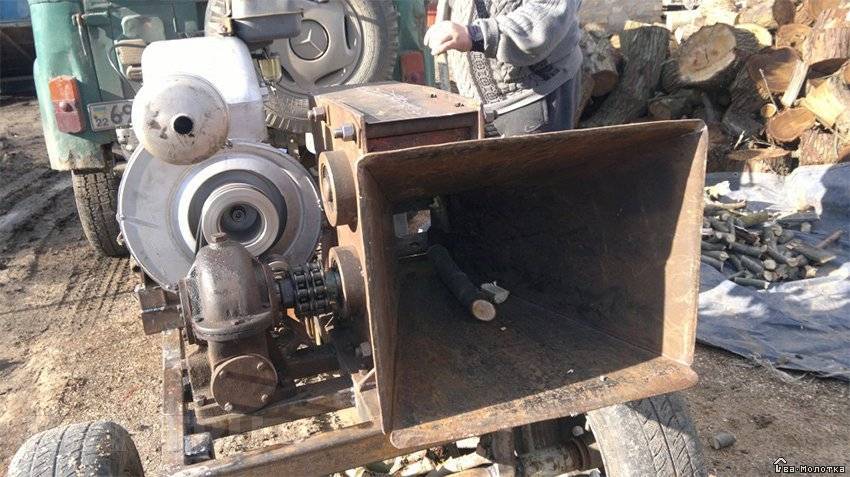 Этот измельчитель рубит ветки на мерные отрезки от 2 до 8 см длиной, удобные для топки бани или дровяного котла отопления. Его конструкция представляет собой два вала с ножами — по 3–4 штуки на один вал, жёстко закреплённых болтами. Ножи можно выточить из рессоры КамАЗа или МАЗа. Если найдете бульдозерный нож, тоже подойдёт. Валы закрепляются на массивных листах параллельно, на расстоянии достаточном, чтобы ножи отрезали ветку, но не цеплялись друг за друга. Свободное вращение валов обеспечивается подшипниками, а их синхронизация достигается за счёт шестерёнчатого сцепления, двигающегося при помощи ремня (цепи) от двигателя. Для привода этого измельчителя целесообразно использовать двигатель большой мощности, но пониженных оборотов.