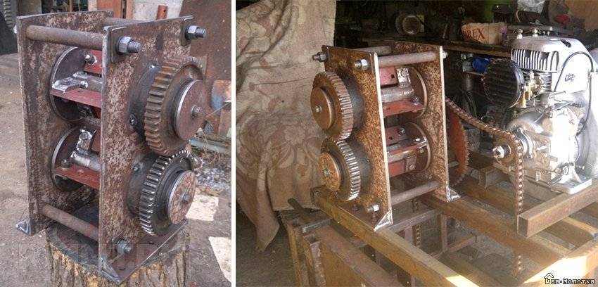Для передачи усилия с двигателя на вал с режущим механизмом потребуются, как минимум, 2 шкива и подшипника. Также может возникнуть потребность и в шестеренках. Оптимальная скорость вращения режущего механизма – 1500 оборотов в минуту. Она обеспечит необходимую производительность и длительный период эксплуатации двигателя.
