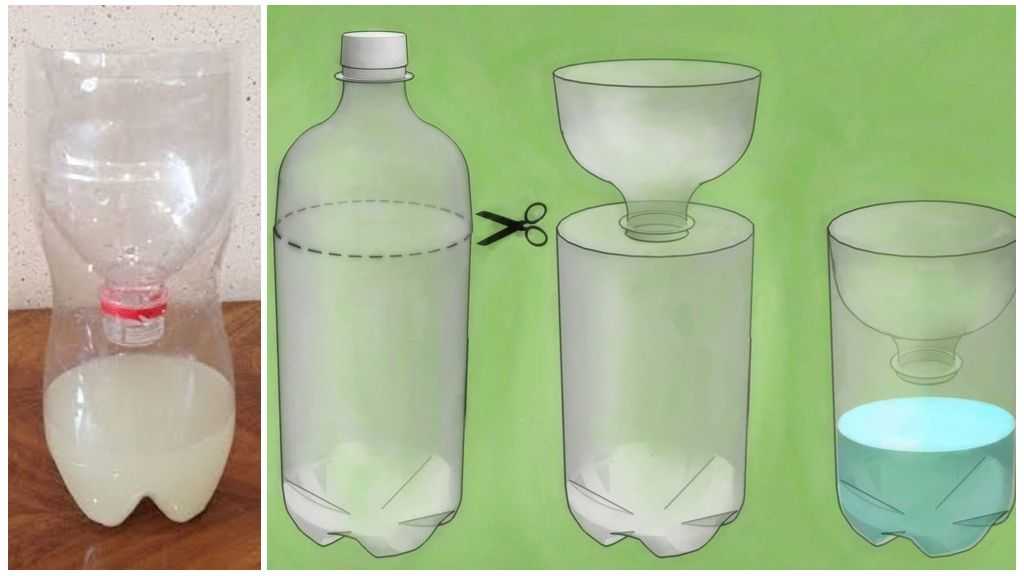 Для создания ловушки требуется пластиковая бутылка объемом полтора литра. Ножом необходимо отрезать ее по линии сужения, с верхней части снять крышку и зафиксировать горлышком вниз в большую часть разрезанной бутылки. Для фиксации можно использовать скотч, если конструкция не кажется достаточно прочной.