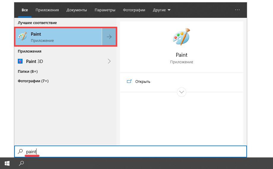 А еще можно прямо в открытом меню «Пуск» напечатать paint и запустить приложение.