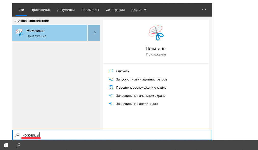 Или напечатав слово ножницы прямо в открытом меню «Пуск».