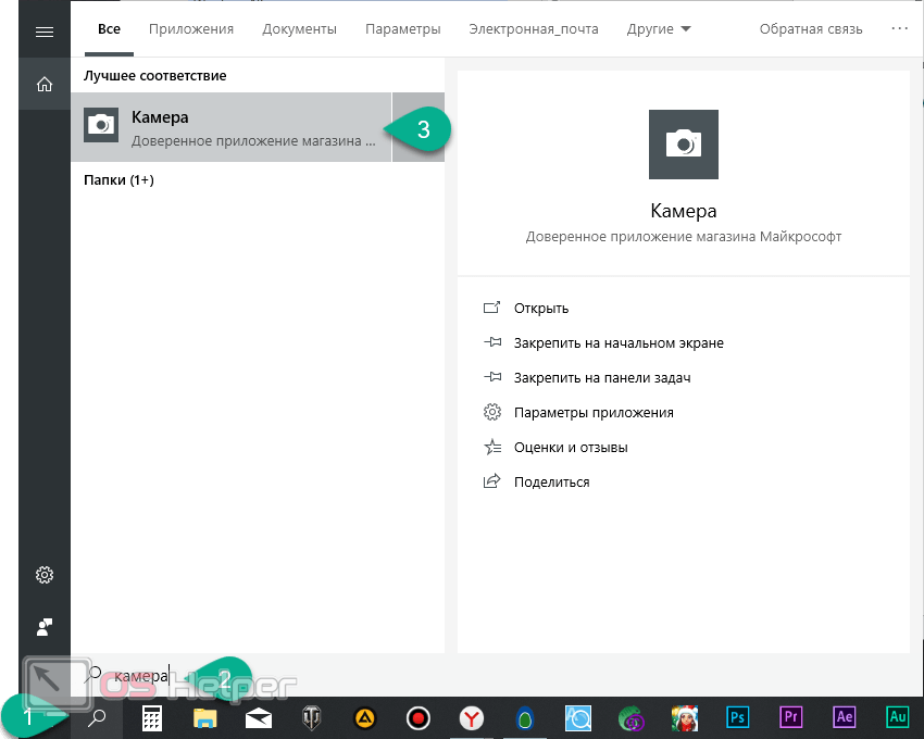 - Открываем меню «Пуск» и в нижней его части в поисковую строку вводим слово «камера». Когда появится нужный нам результат, жмем по нему.