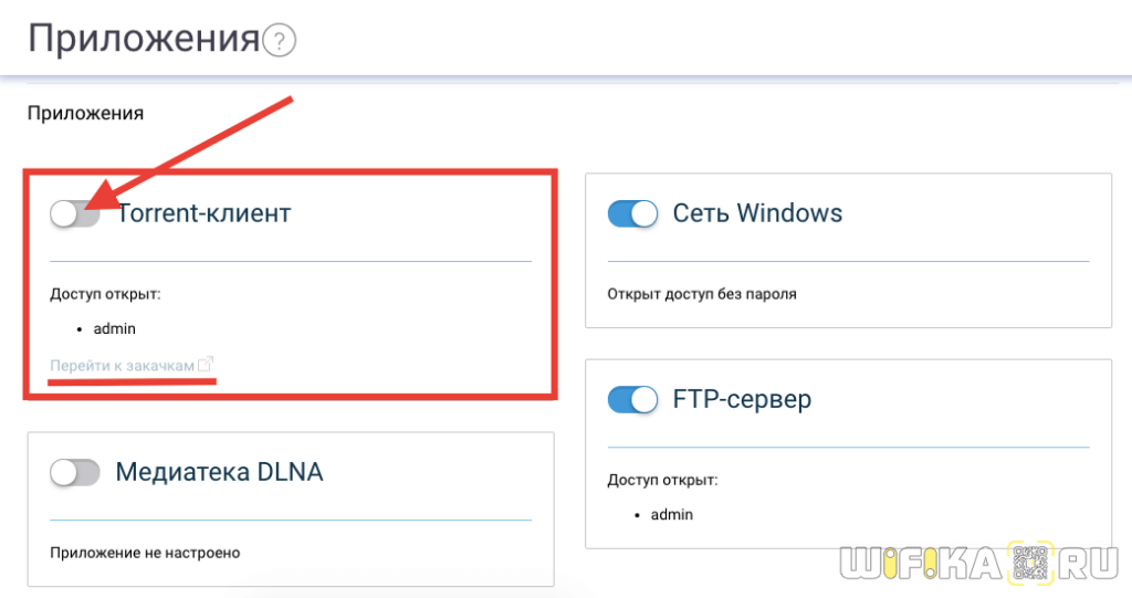 Теперь активируем torrent-клиент Transmission переключаетелем в разделе «Приложения»