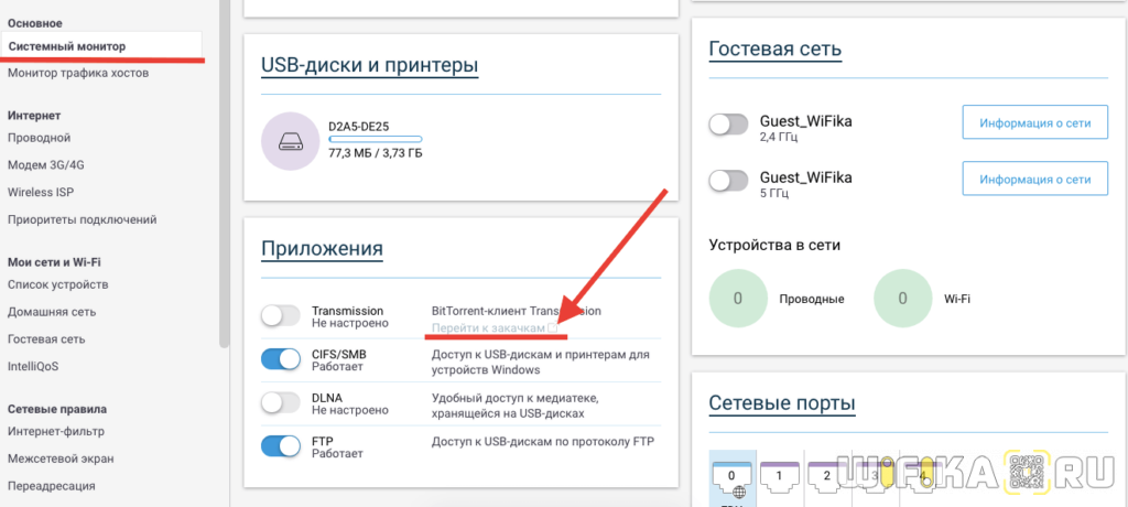 После этого возвращаемся на главную страницу «Системный монитор» и в блоке «Приложения» жмем на ссылку «Перейти к закачкам»