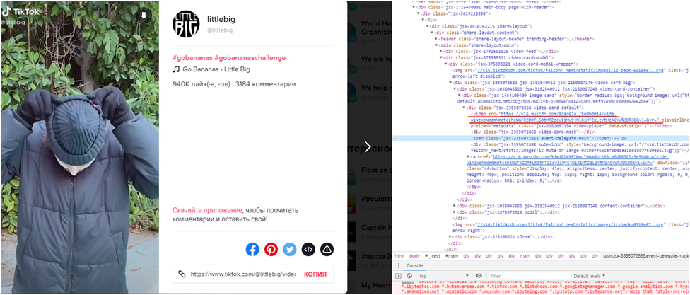 Плагины для браузеров скачивают файл, обращаясь напрямую к его адресу на серверах соцсети. Сделать это мы можем и самостоятельно, вручную. Для этого мы жмём правой кнопкой по клипу, выбираем «Исследовать элемент» и копируем ссылку, которая будет над строчкой, которая выделится. Она будет располагаться после фрагмента «video src=». Затем переходим по URL и скачиваем открывшийся ролик.