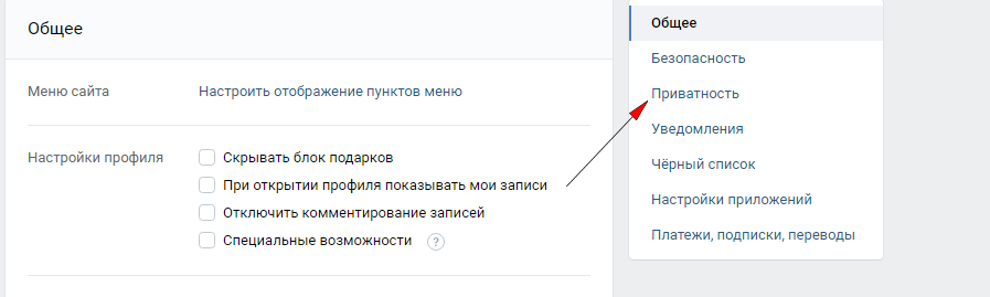 После того как раздел с настройками открылся, в правом углу будет список с разными пунктами. Вам же нужен раздел под названием «Приватность».