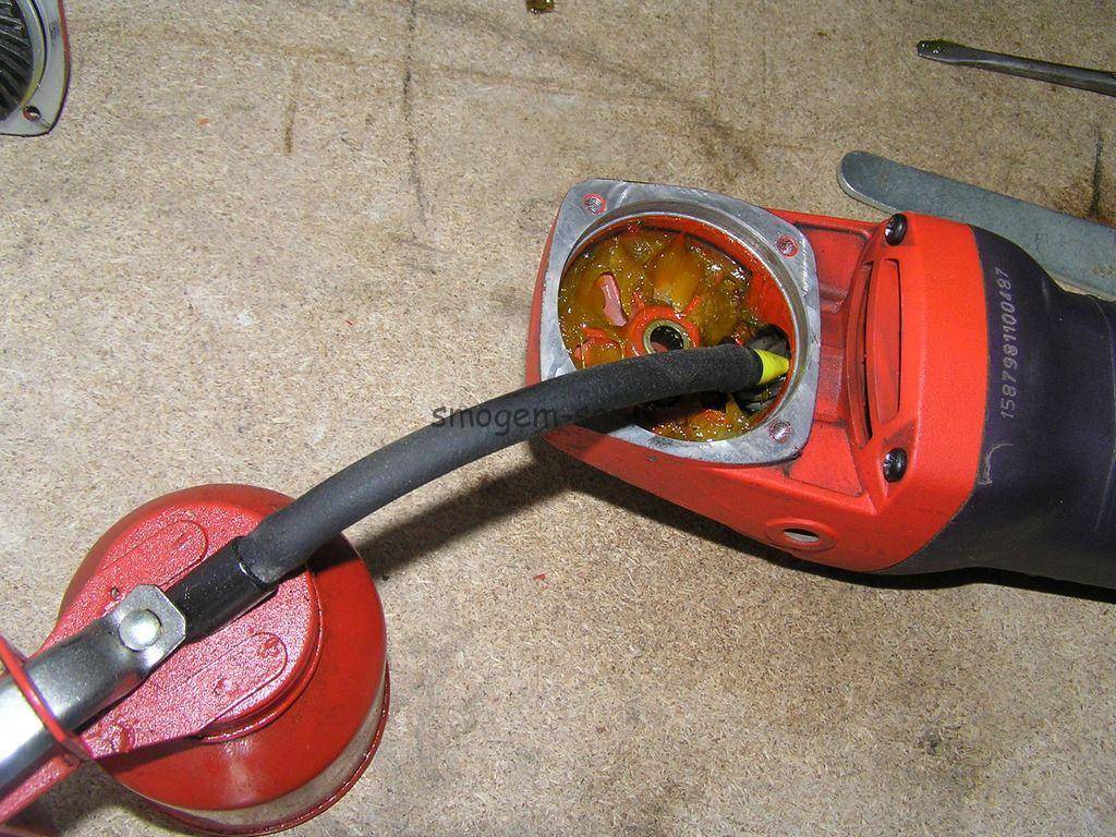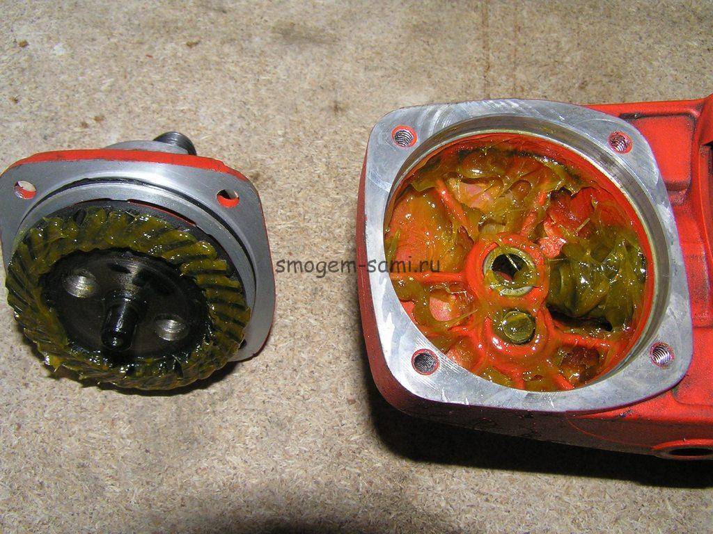 Чтобы убедиться в необходимости внесения нового объема смазки, редуктор требуется разобрать, выкрутив на его крышке винты. Внутри находится пара косозубых шестеренок. Малая размещена на якоре и применяется для приведения в действие большой, расположенной на вторичном валу. К этому валу прикрепляется шлифовальный либо отрезной диск.