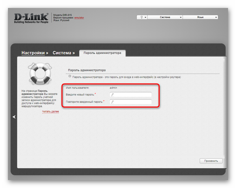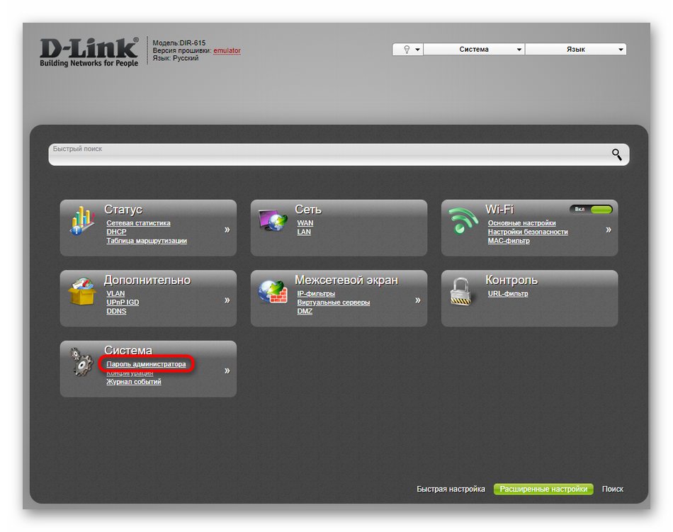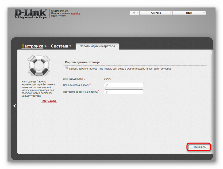 Для начала продемонстрируем метод изменения пароля администратора, который требуется при входе веб-интерфейс. Для этого в старой версии интернет-центра D-Link потребуется выполнить всего несколько простых действий:
