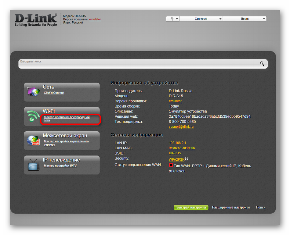 - Находясь в главном разделе интернет-центра кликните по надписи «Мастер настройки беспроводной сети».