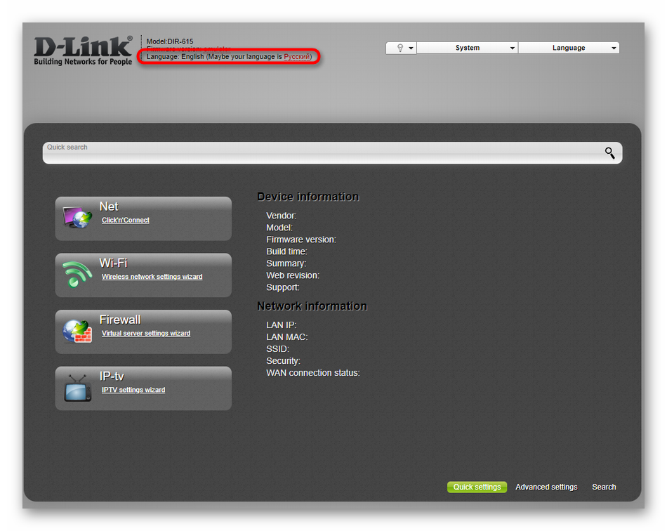- После успешной авторизации в интернет-центре рекомендуется сменить язык на русский, чтобы не запутаться в названиях меню.