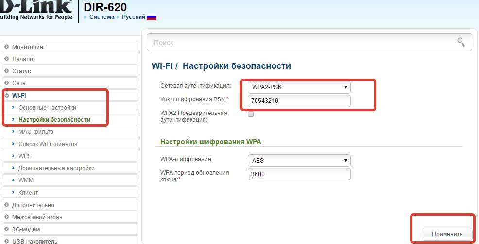 Ключ безопасности Wi-Fi — устанавливается пользователем вручную, и, в отличие от пароля к роутеру, он должен иметь большую длину и быть сложным, то есть состоять из строчных и заглавных букв, а также цифр, чтобы избежать подключения сторонних пользователей. Большое значение имеет выбор типа шифрования, которых на данный момент существует два: