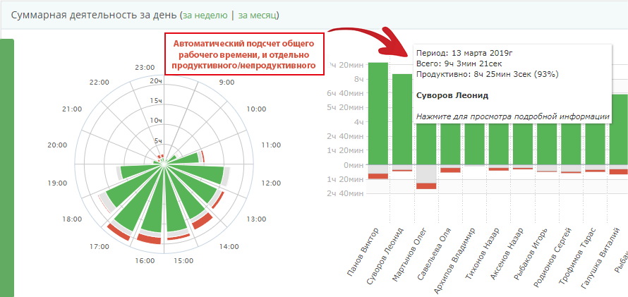 Так выглядит отчет о рабочем дне — видно, кто выключает ПК раньше, а кто работает дольше