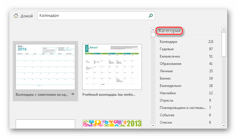 Как видите, в программе много разных встроенных календарей. Они скомпонованы по категориям, что облегчит поиск. Найдите подходящий шаблон
