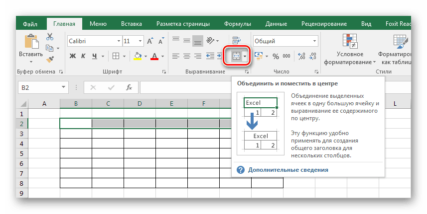 Выделите ячейки с B2 по H2. Объедините их, воспользовавшись командой «Объединить и поместить в центре».