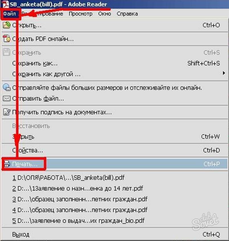 Откройте PDF документ в Adobe Reader и идите в меню «Файл» — «Печать»