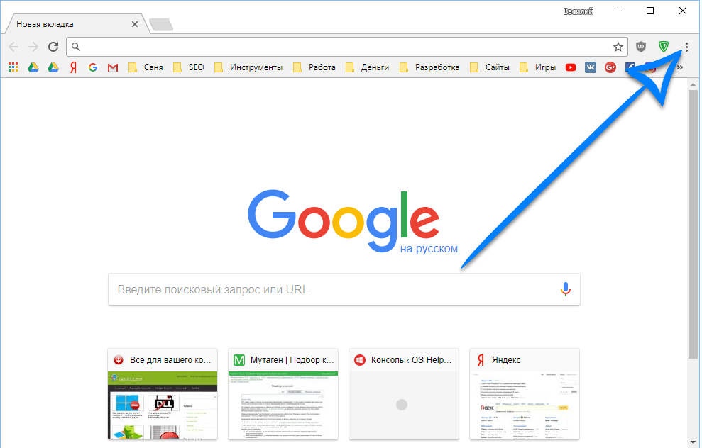 - Переходим к меню обозревателя. В Хроме это иконка с изображением трех точек.