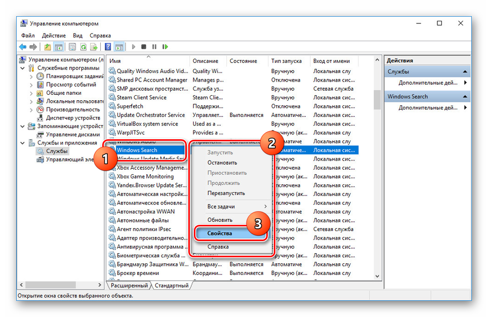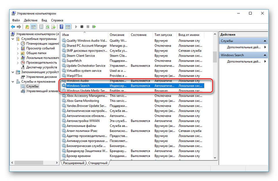Служба «Windows Search» настроена на автоматический запуск после старта Windows. Служба отвечает за индексирование контента, кэширование свойств и результатов поиска для файлов, электронной почты и другого контента.