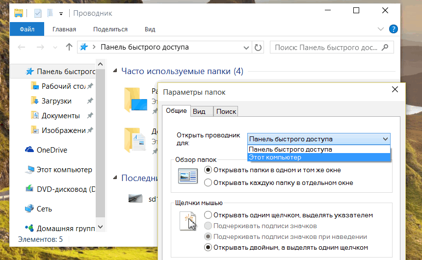 Шаг 1. Прежде всего, перед тем, как избавиться от панели быстрого доступа, нам нужно сделать так, чтобы она не открывалась по умолчанию при старте проводника, иначе, когда её не станет, Проводник будет у вас закрываться с ошибкой при каждом запуске.