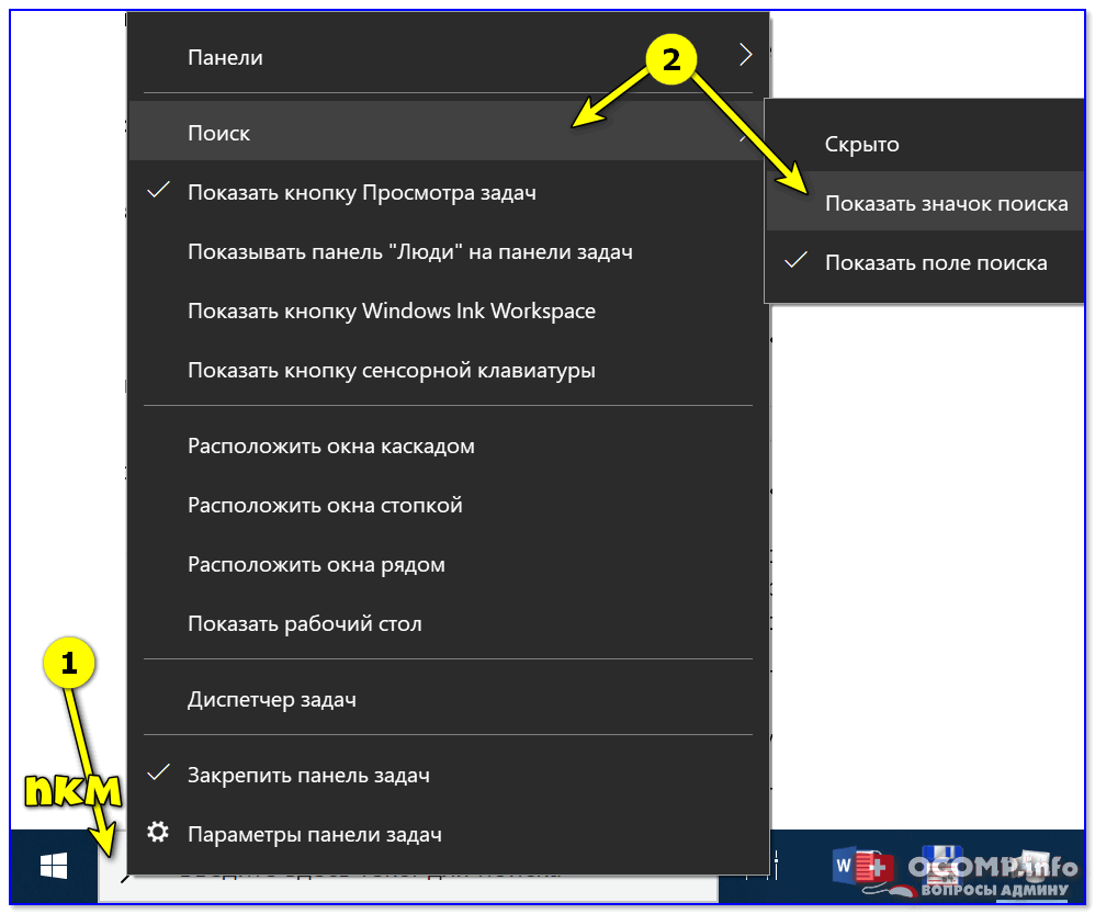 Достаточно кликнуть правой кнопкой мыши по «этой» строке, затем в появившемся меню во вкладке «Поиск» выбрать вариант ее отображения: «скрыто» или «показать значок поиска».