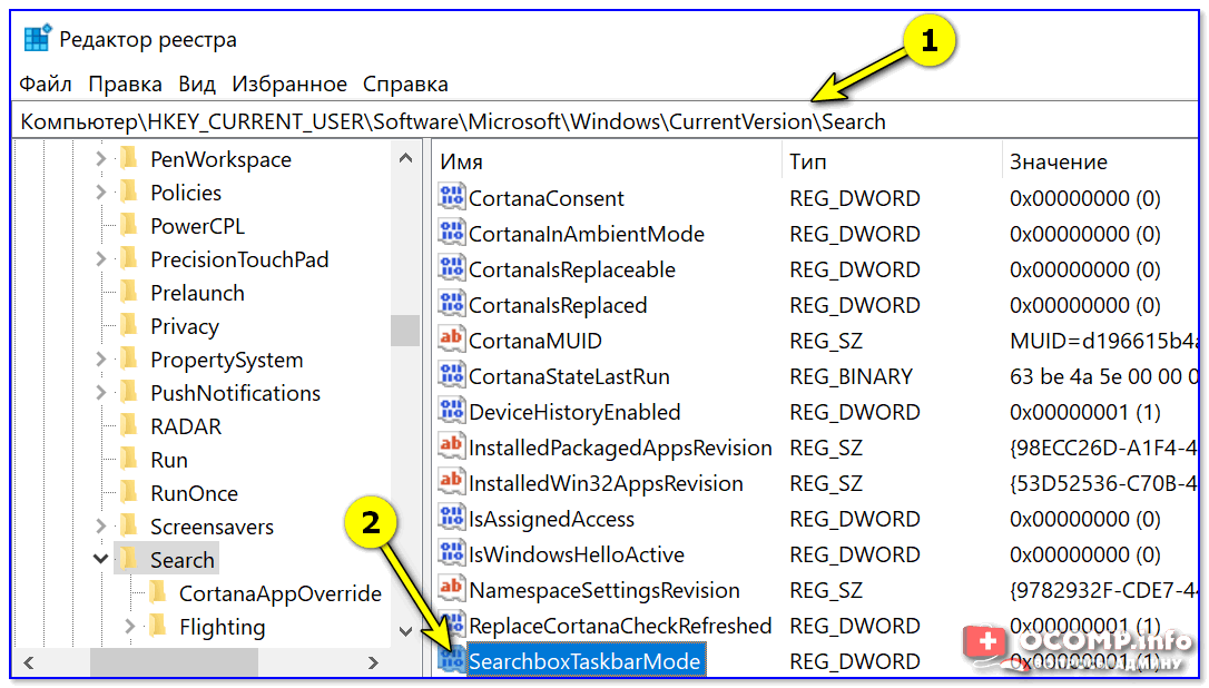 В нем есть параметр SearchboxTaskbarMode (он отвечает за отображение строки на панели задач). Его нужно изменить.
