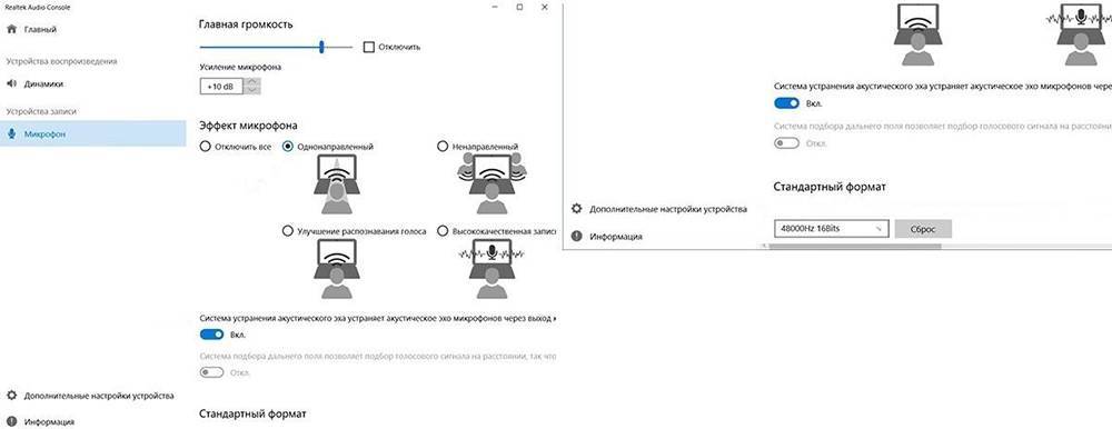Сама утилита очень простая и понятная. Во вкладке «Микрофон» выбирается подходящий эффект, настраивается громкость и усиление. Также можно активировать опцию устранения акустического эха, задать разрядность и частоту дискретизации.