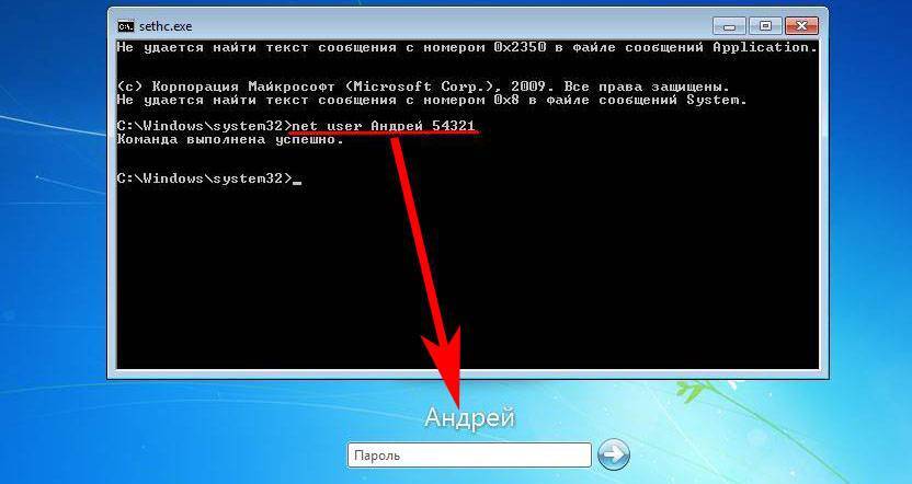 - Делаем перезагрузку ПК, жмем много раз кнопку «Shift», выскочит командная строка. Меняем код «Net user (имя учетки) (новый password)» .