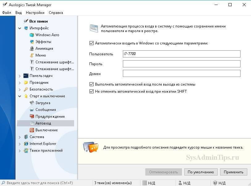 Пример окна программы от Auslogics, где настраивается автоматизация входа в систему: