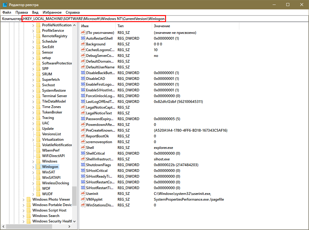В редакторе реестра через дерево папок откройте путь: HKEY_LOCAL_MACHINE\SOFTWARE\Microsoft\Windows NT\CurrentVersion\Winlogon.