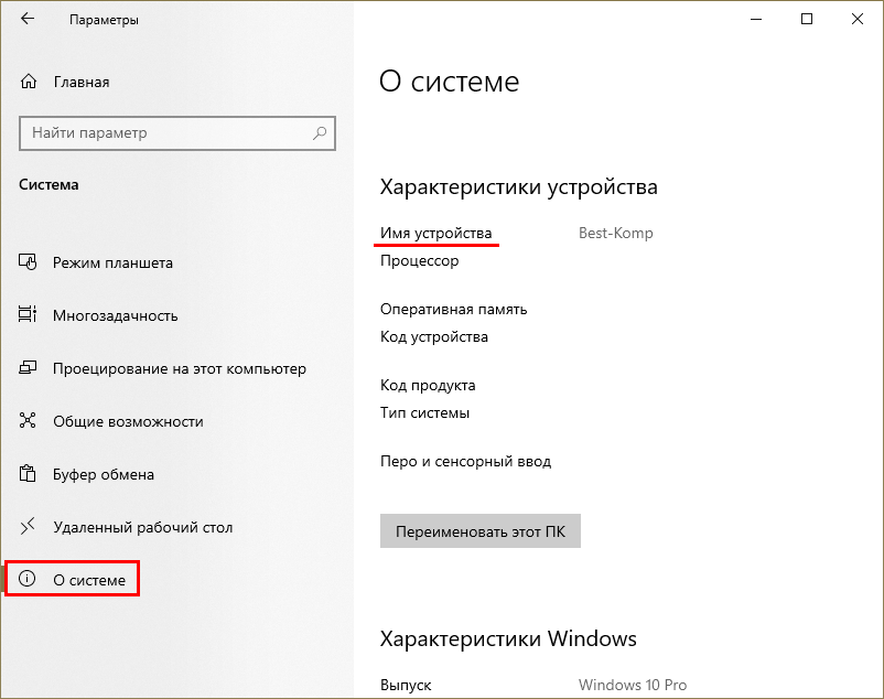 - DefaultDomainName. Здесь необходимо написать имя компьютера. Чтобы его узнать, придется зайти в «Параметры». Нажав на самый первый раздел, следует найти пункт «О системе» (обычно находится в самом низу).