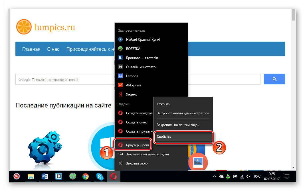 - Открываем веб-браузер, который традиционно используем, на данный момент это Opera.Теперь жмём правой клавишей по ярлычку, находящемуся на панели задач, а опосля избираем «Opera» – «Свойства».