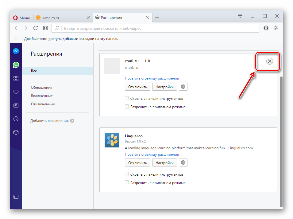 5. Кликните «Удалить» в блоках расширений от Mail.ru.