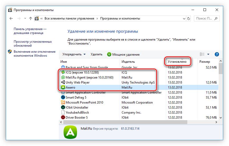 Чтобы в списке всех установленных на компьютере программ быстро найти продукты от Mail.Ru, рекомендуем упорядочить их по дате установки.