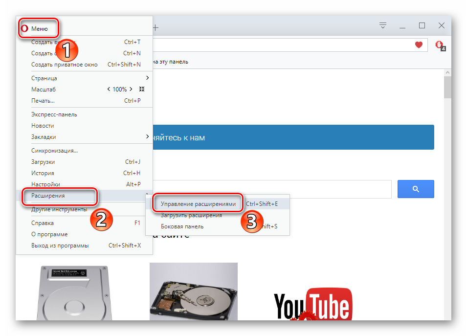 Снова перебегаем в Opera и открываем «Меню», а сейчас «Расширения»-«Управление».