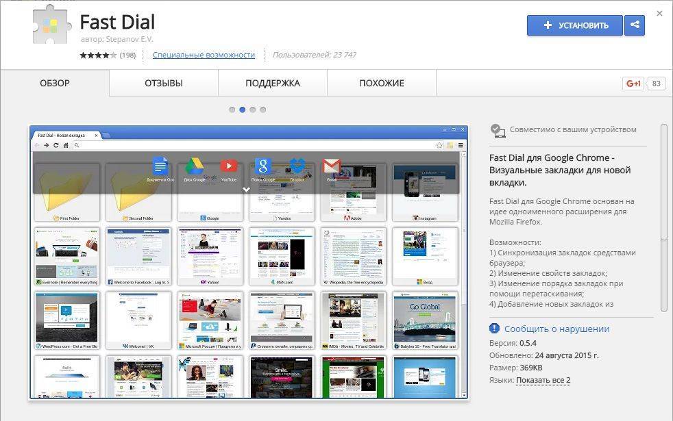 Эти визуальные закладки созданы для тех, кто любит настраивать все до самых мелочей. Присутствует возможность изменения количества строк и столбцов миниатюр, размера и расстояния между миниатюрами, группирования закладок по папкам и десяток других опций. На экране нет никаких левых ссылок и прогнозов погоды, лишь сами миниатюры и кнопка открытия сервисов Google у верхней границы.