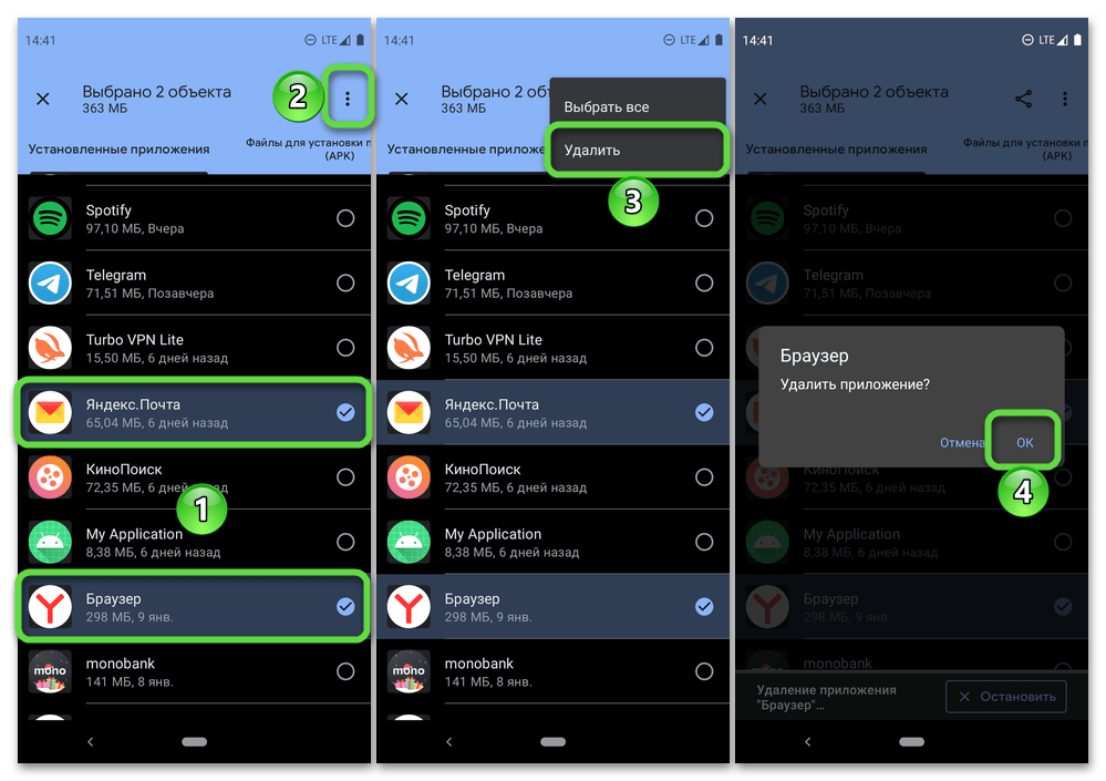 Google Files предоставляет возможность массового удаления программ – для этого выделите более ненужные элементы, немного задержав палец на первом, и затем отметив касанием остальные. Вызовите меню и выберите в нем пункт «Удалить», после чего подтвердите действие (это потребуется сделать для каждого компонента отдельно).