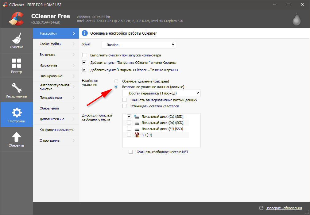 Если в будущем Вы планируете использовать CCleaner по прямому назначению для очистки мусора на компьютере и не нуждаетесь в постоянном надежном удалении данных, рекомендуем вернуть опцию «Надёжное удаление» в положение «Обычное удаление (быстрее)» для уменьшения нагрузки на диски компьютера.