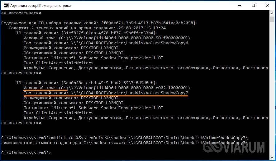 В данном примере точка восстановления имеет номер 7, у вас значение будет другим. В результате выполнения команды в корне диска С появится символическая ссылка shadow.