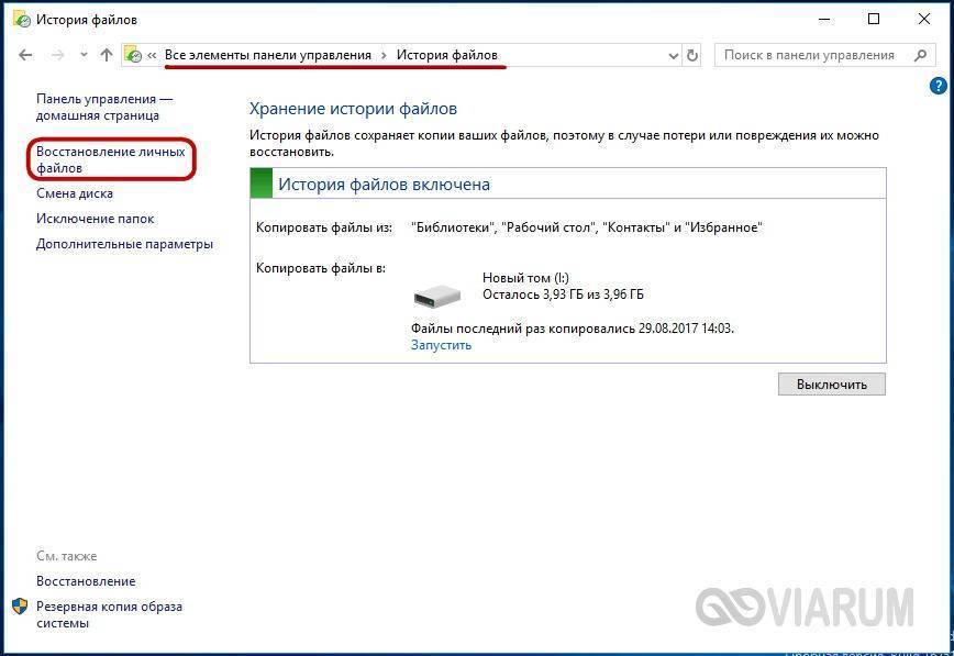 Весьма желательно, чтобы в системе также была задействована функция «История файлов», обеспечивающая периодическое резервное копирование содержимого пользовательских библиотек и рабочего стола.