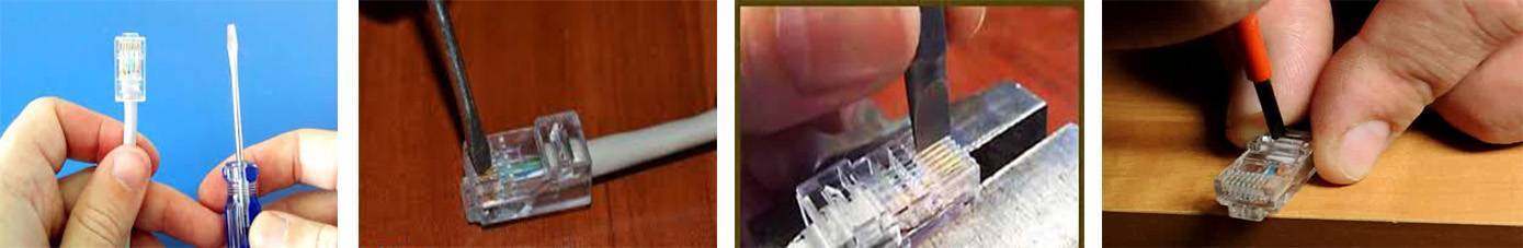При отсутствии кримпера можно обойтись отвёрткой для соединения жил с коннектором. Подготовительный этап в этом случае тот же, что и с кримпером. Нужно аккуратно удалить внешнюю изоляцию с кабеля, разделить жилы и произвести обрезку торцов строго под углом 90 градусов к оси кабеля. После этого вводят жилки в коннектор по соответствующим канавкам, а прижим каждого проводка осуществляют с помощью отвёртки. Такая коннекция будет работать, но по качеству обжима, естественно, уступит кримперному.
